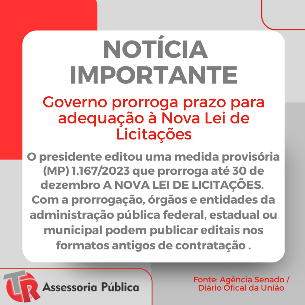 Com a prorrogação, órgãos e entidades da administração pública federal, estadual ou municipal podem publicar editais nos formatos antigos de contratação até o dia 29 de dezembro de 2023. A opção escolhida deve estar expressamente indicada no edital.